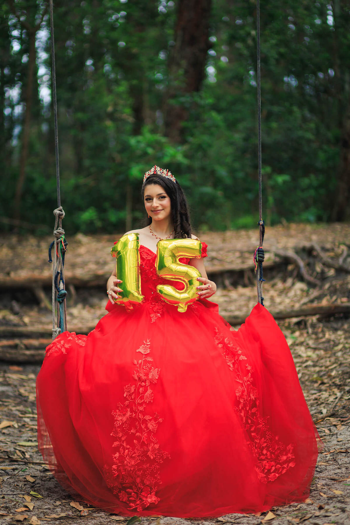 Debutante Legna sentada em um balanço no Bosque do Moçambique segurando balões dourados com o número 15, usando vestido vermelho de princesa.