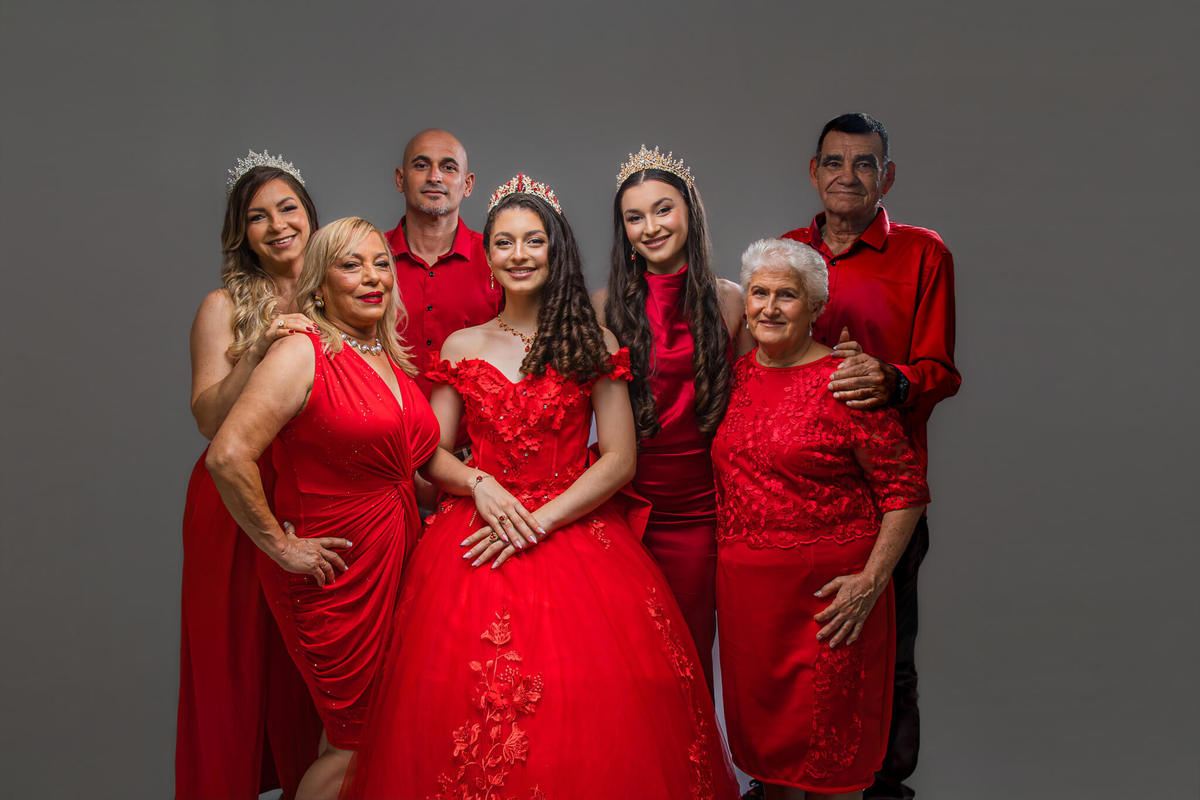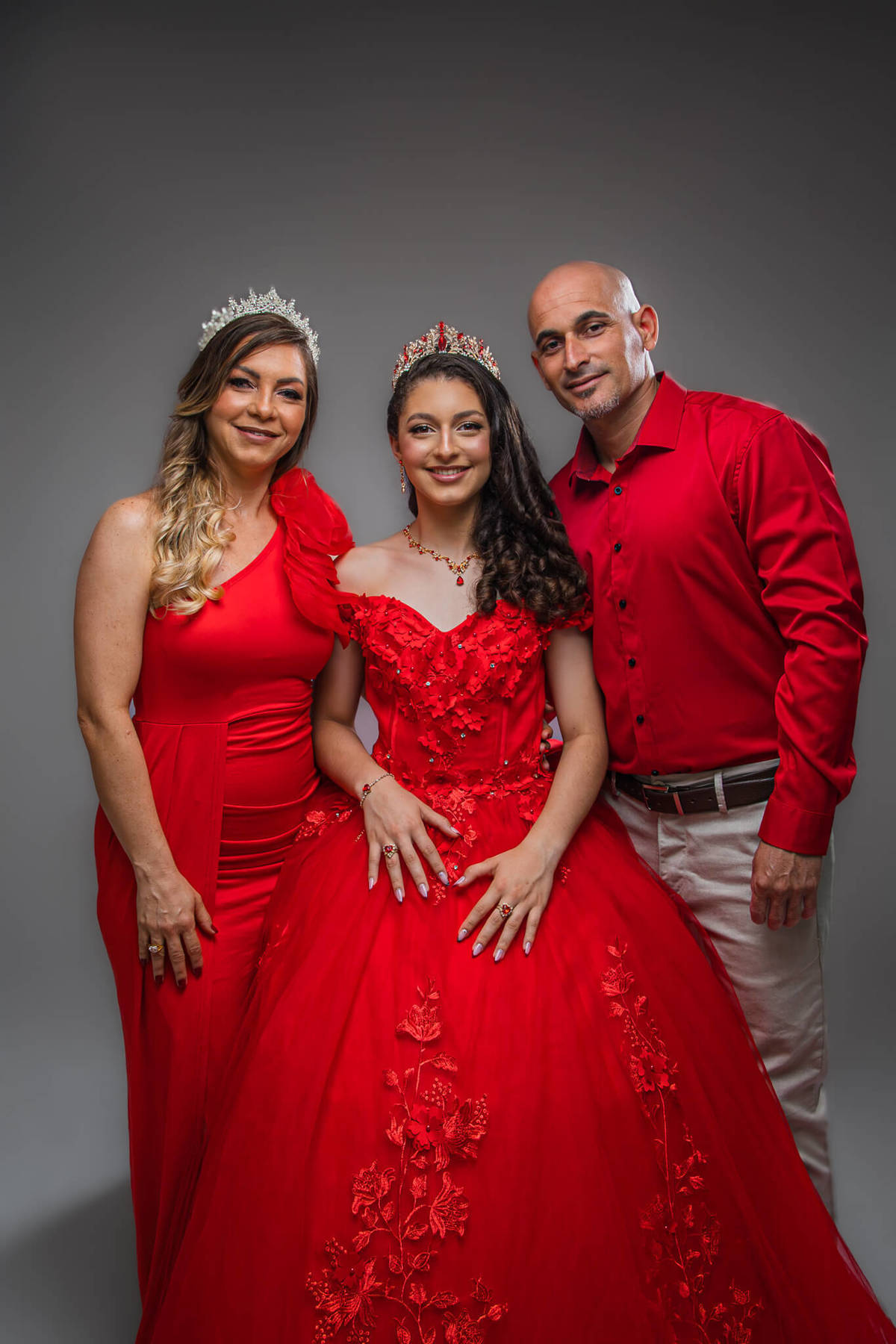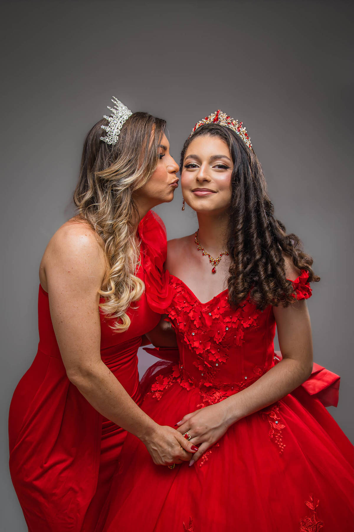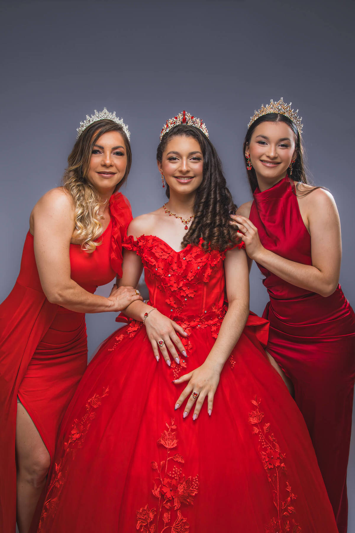 Retrato clássico de 15 anos em estúdio com fundo cinza, debutante usando vestido vermelho bordado e coroa, fazendo pose elegante.