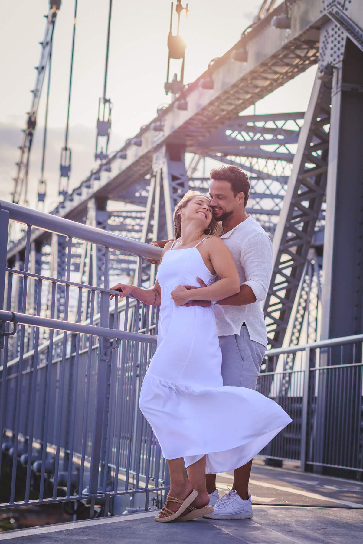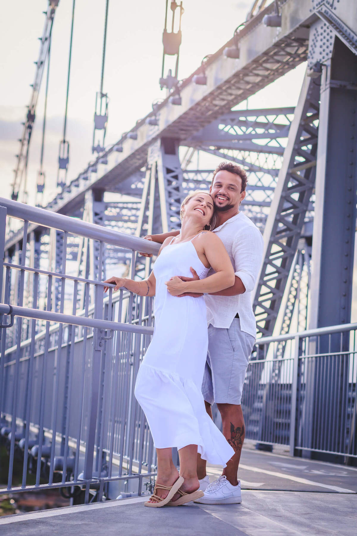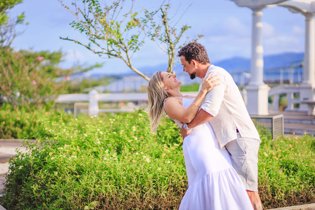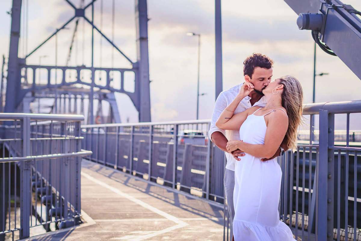 A Ponte Hercílio Luz é um dos cartões-postais mais famosos de Florianópolis, e não é à toa! Sua arquitetura imponente e a vista deslumbrante para o mar proporcionam um cenário único e cheio de significado para ensaios fotográficos. Para o casal, foi o local perfeito para celebrar o amor e a conexão que os une.