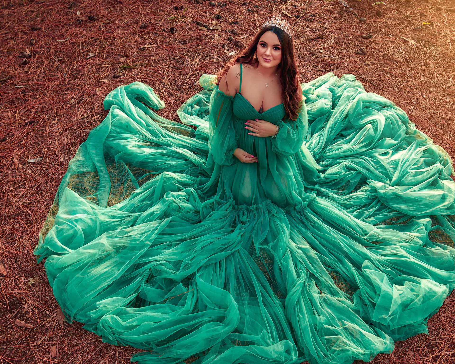 Ensaio fotográfico gestante com figurinos de princesa, luz natural e direção delicada para capturar sua beleza única nesse momento mágico.